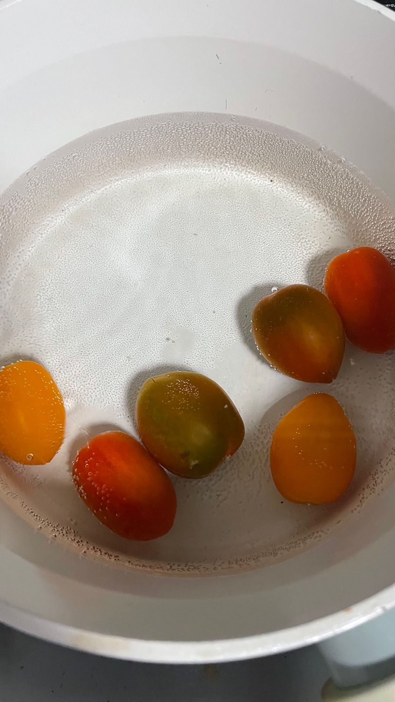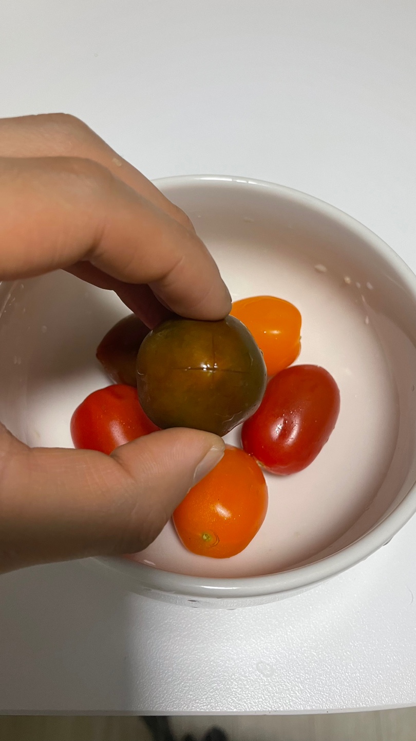 4. 끓는 물에 칼집을 낸 방울토마토를 살짝 데치듯 1분에서 2분정도 조리 해 줍니다.