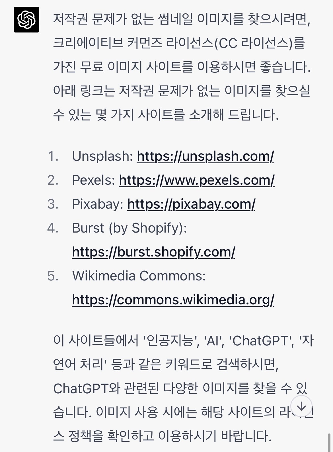 여러가지의 무료 저작권에 관한 사이트를 추천해 주었습니다.